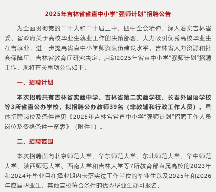 1.2025年吉林省省直中小学“强师计划”招聘工作人员岗位及资格条件一览表: