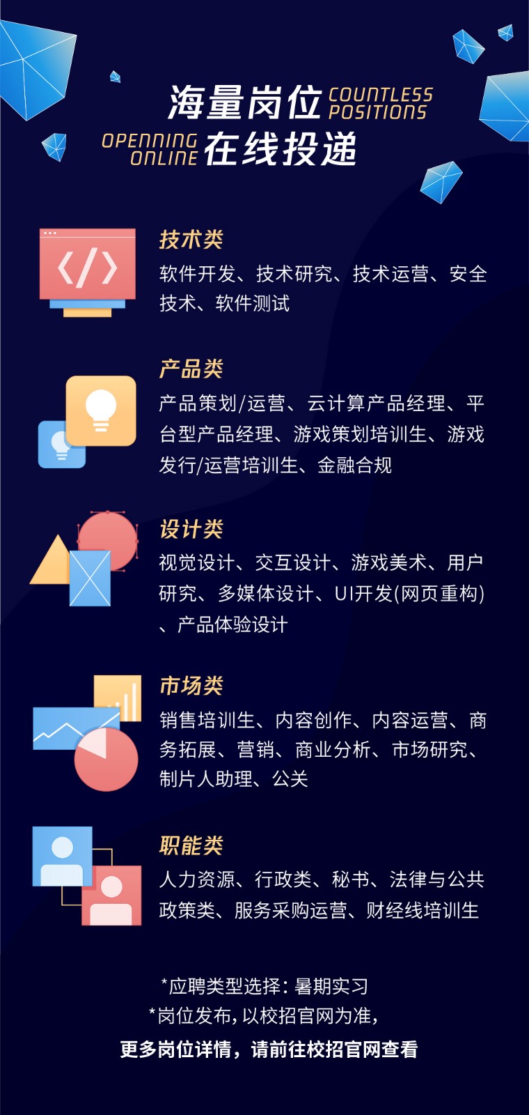 本次暑期实习生招聘主要针对2021届毕业生(毕业时间在2020年9月-2021年8月),招聘岗位涉及技术、产品、设计、市场、职能等各类,包括软件开发、技术研究、安全技术、软件测试、技术运营、产品策划/运营、游戏策划、游戏发行/运营、内容运营、设计、游戏美术、商业分析、市场研究、营销、销售、商务、人力资源、财经、法务、行政、采购等。海量岗位,在线投递、安心求职!