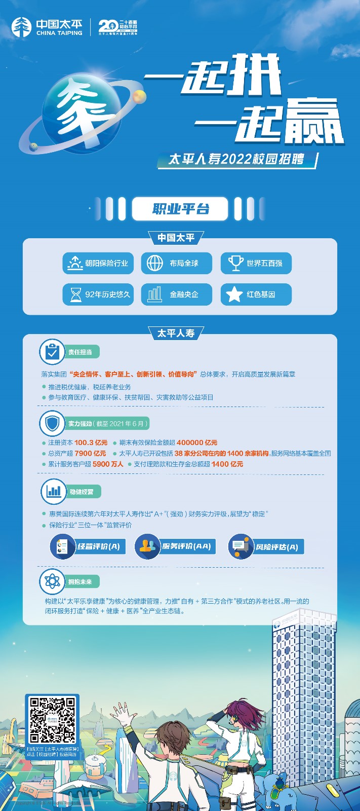 太平人寿隶属于中国太平保险集团有限责任公司(以下简称“中国太平”),是国内中大型寿险企业之一。公司总部设在上海,注册资本100.3亿元,总资产超7900亿元。凭借稳健的财务表现,公司连续六年获得惠誉国际“A+”(强劲)财务实力评级。同时,在最新公布的保险行业“三位一体”监管评价体系结果中,太平人寿的法人机构经营评价、服务评价、风险综合评级分获A级、AA级和A级。目前,太平人寿已开设包括38家分公司在内的1400余家机构,服务网络基本覆盖全国。