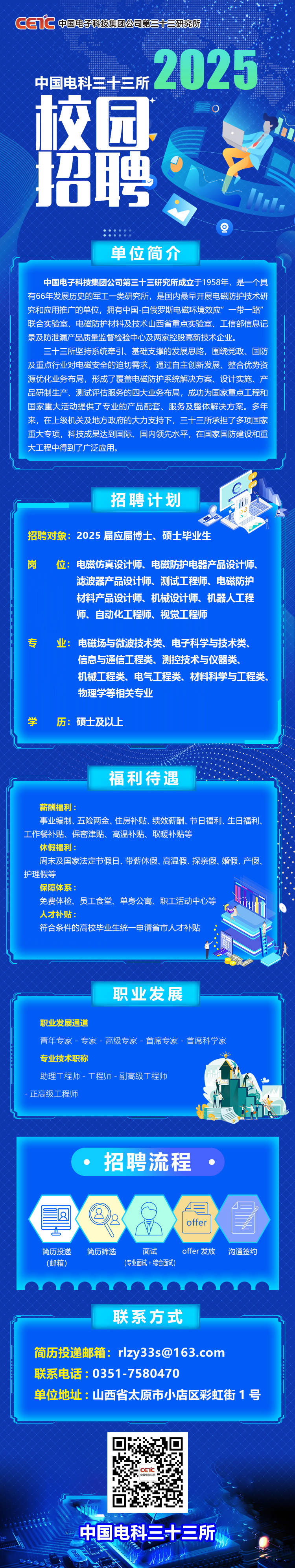 中国电子科技集团公司第三十三研究所成立于1958年,是一个具有66年发展历史的军工一类研究所,是国内最早开展电磁防护技术研究和应用推广的单位,拥有中国-白俄罗斯电磁环境效应“一带一路”联合实验室、电磁防护材料及技术山西省重点实验室、工信部信息记录及防泄漏产品质量监督检验中心及两家控股高新技术企业。