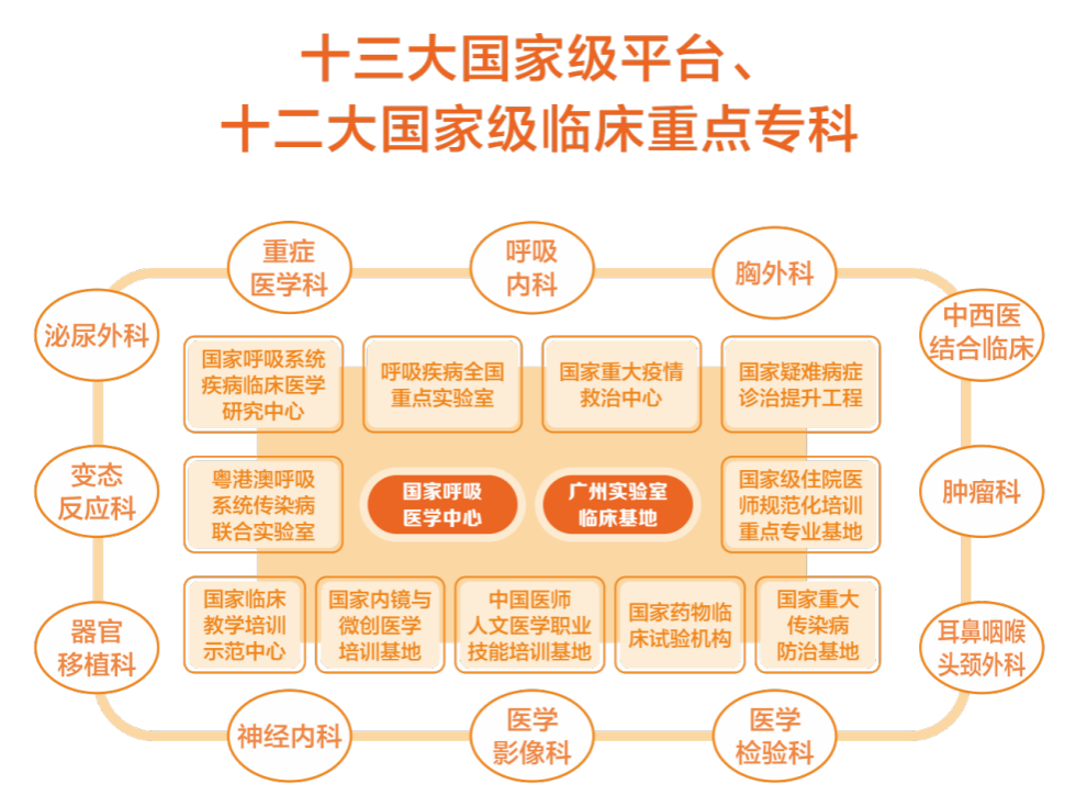 医院拥有十三大国家级平台:国家呼吸医学中心、广州实验室临床基地、呼吸疾病全国重点实验室、国家疑难病症诊治能力提升工程、国家重大疫情救治中心、国家重大传染病防治基地、国家呼吸系统疾病临床医学研究中心、国家临床教学培训示范中心、国家级住院医师规范化培训重点专业基地、中国医师人文医学职业技能培训基地、卫生部内镜与微创医学考培基地、粤港澳呼吸系统传染病联合实验室、国家药物临床试验机构。十二大国家临床重点专科:呼吸内科、胸外科、重症医学科、泌尿外科、变态反应科、肿瘤科,耳鼻喉科,器官移植科,中西医结合科,神经内科,医学影像科,医学检验科。